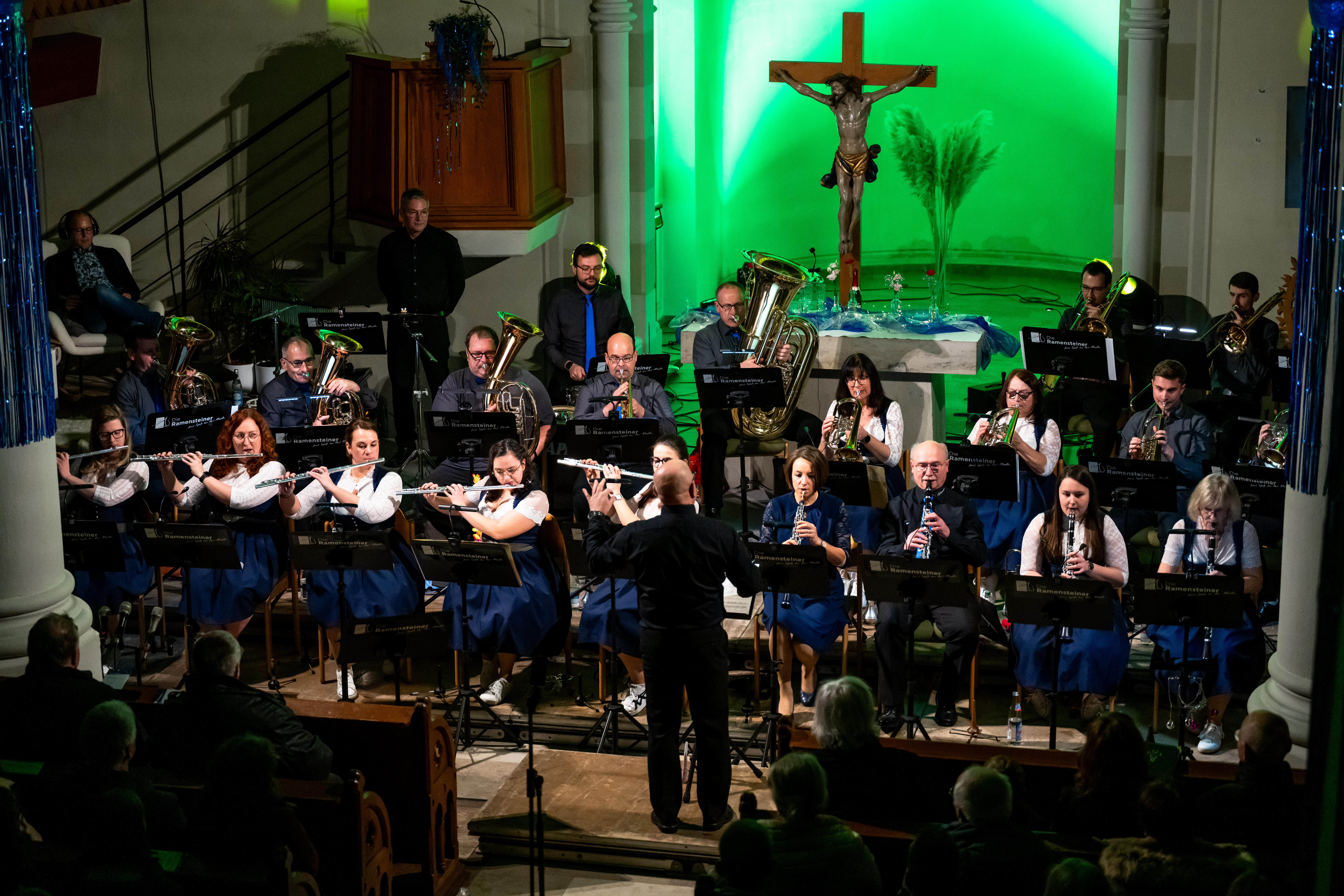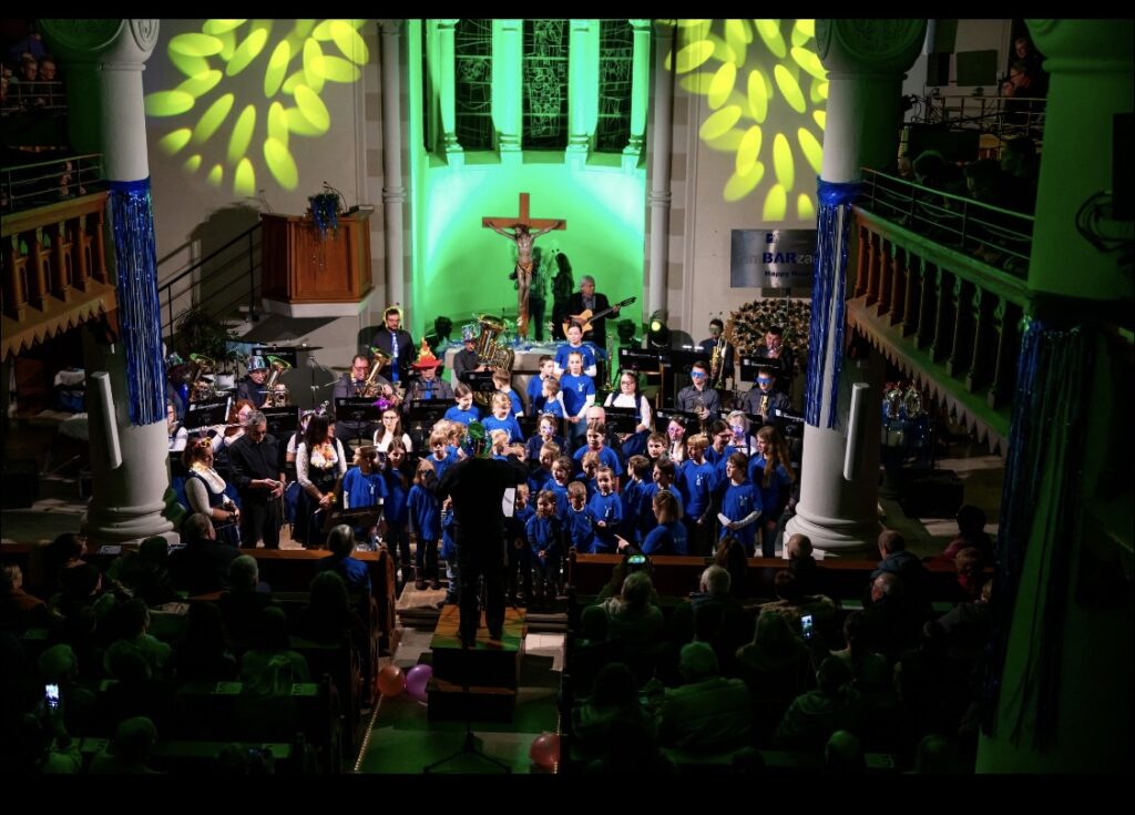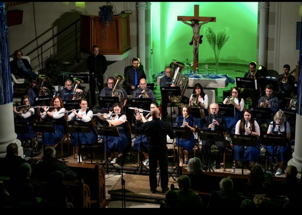 Am 11.01.2026 feierten wir in der vollbesetzten Martinskirche den Auftakt zum 10-jährigen Bestehen der Musikkapelle mit unseren Neujahrskonzert. Aufgrund dessen wollen wir unseren Besuchern etwas Neues bieten. Zusammen mit unserer zahlreichen Jugend, bestehend aus musikalischer Früherziehung, Blockflöten und Jugenkapelle wurde das Konzert durch Christian Prater eröffnet. In diesem Jahr wurden die gespielten Musikstücke an das kleine Theater, gespielt von Christian Prater und Annelie Schön, ausgerichtet. Gestartet hat demnach die Jugend mit dem „McRonalds March“, gefolgt von einer kleinen Theatereinlage von Christian. Thema des Theaterstücks war natürlich das Jubiläumsjahr der Ramensteiner mit einer passenden Party hierzu. Passend hierzu ging es dann durch die aktive Kapelle weiter mit dem klassischen Titel „Rossini“ und den „Movie Blockbustern“. Christian Prater erzählte mit Hilfe von Annelie Schön in Kürze die Geschichte des 10-jährigen Bestehens der Ramensteiner. Das abwechslungsreiche Programm lud dann, unterstrichen durch farbige Lichteffekte und Videos, mit dem „Eighties Flashback“ zum Mittanzen ein. Ulrich Kramer überzeugte das Publikum als Solosänger mit „Auf gute Freunde“ der Böhsen Onkelz. Hier konnten die Zuhörer ein phänomenales Gitarrensolo von Tobias Thumm lauschen. Auch Pfarrerin Hekmat hat sich zu den Ramensteinern und dem Thema Musik einige Gedanken gemacht und diese mit allen geteilt. Um das Theaterstück musikalisch weiterhin zu unterstützen, daa Annelie Schön „am Radio drehte“, wurden Auszüge aus „Schatzi schenk mir ein Foto“ und der „Vogelwiese“ angespielt, was das Publikum zum Mitklatschen animierte. Mit „I want it that way“ und „Shut up and dance with me“ schlossen die Ramensteiner das Konzert im Party-Modus ab und erreichten hier den Höhepunkt.