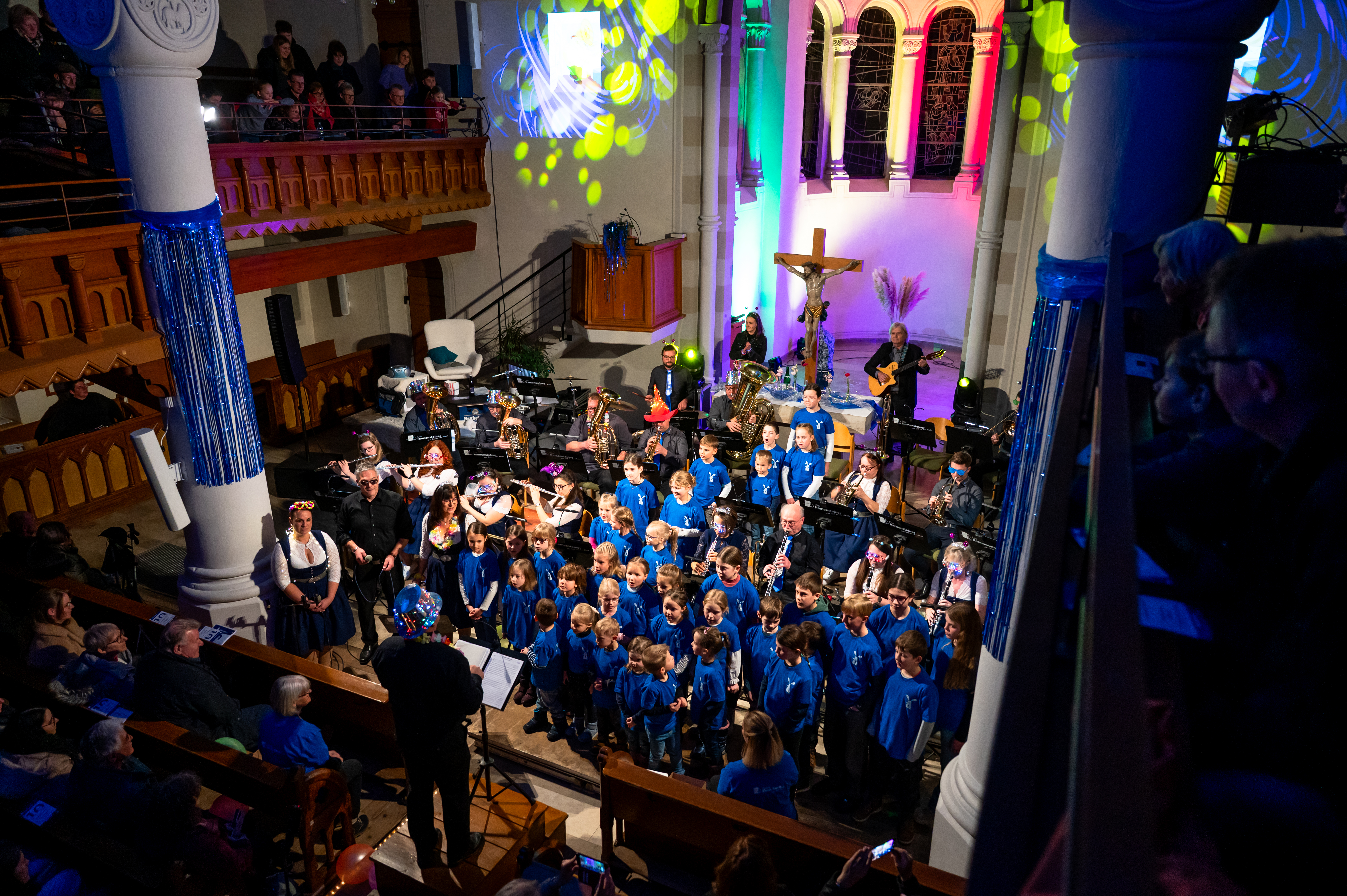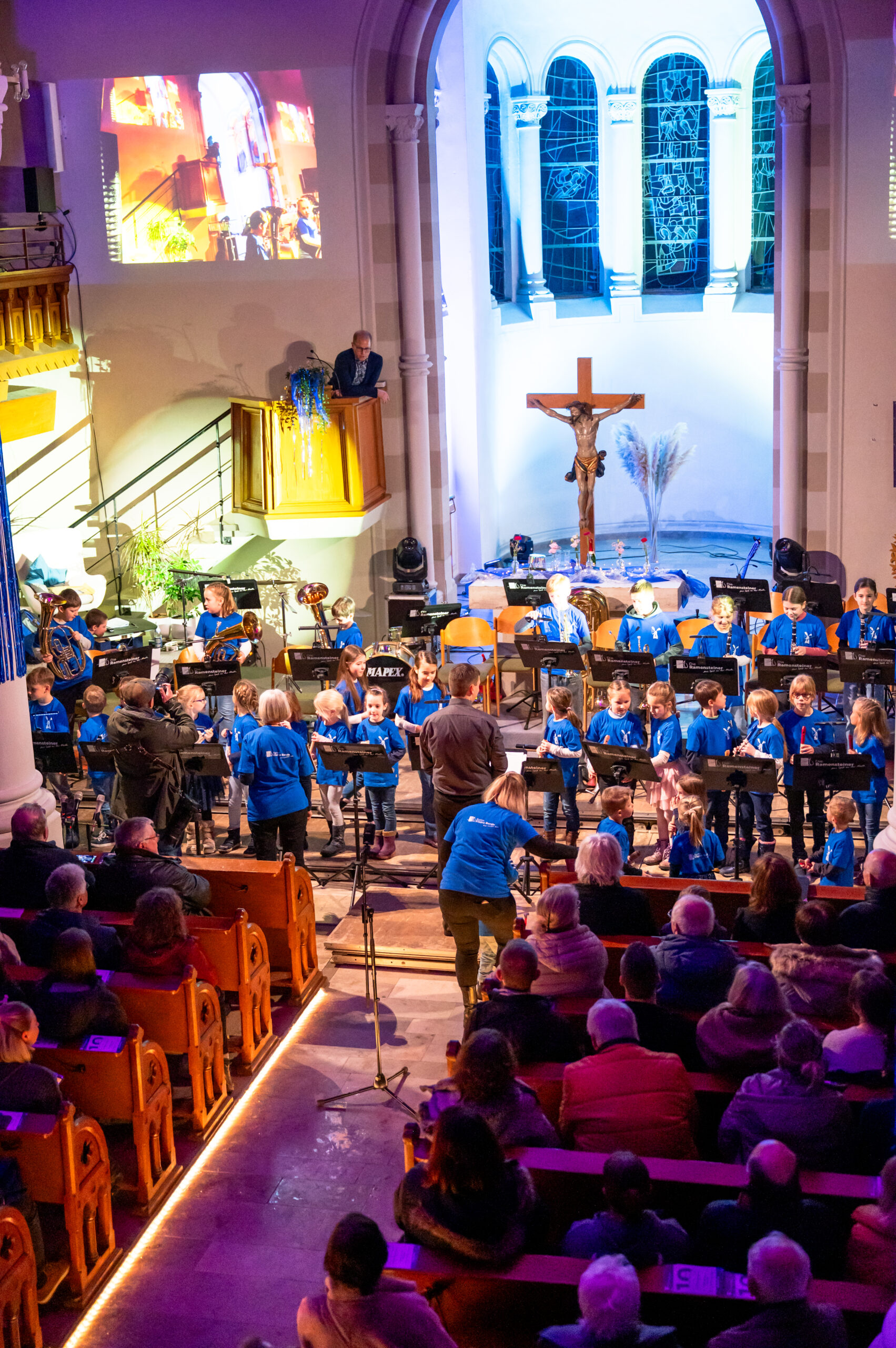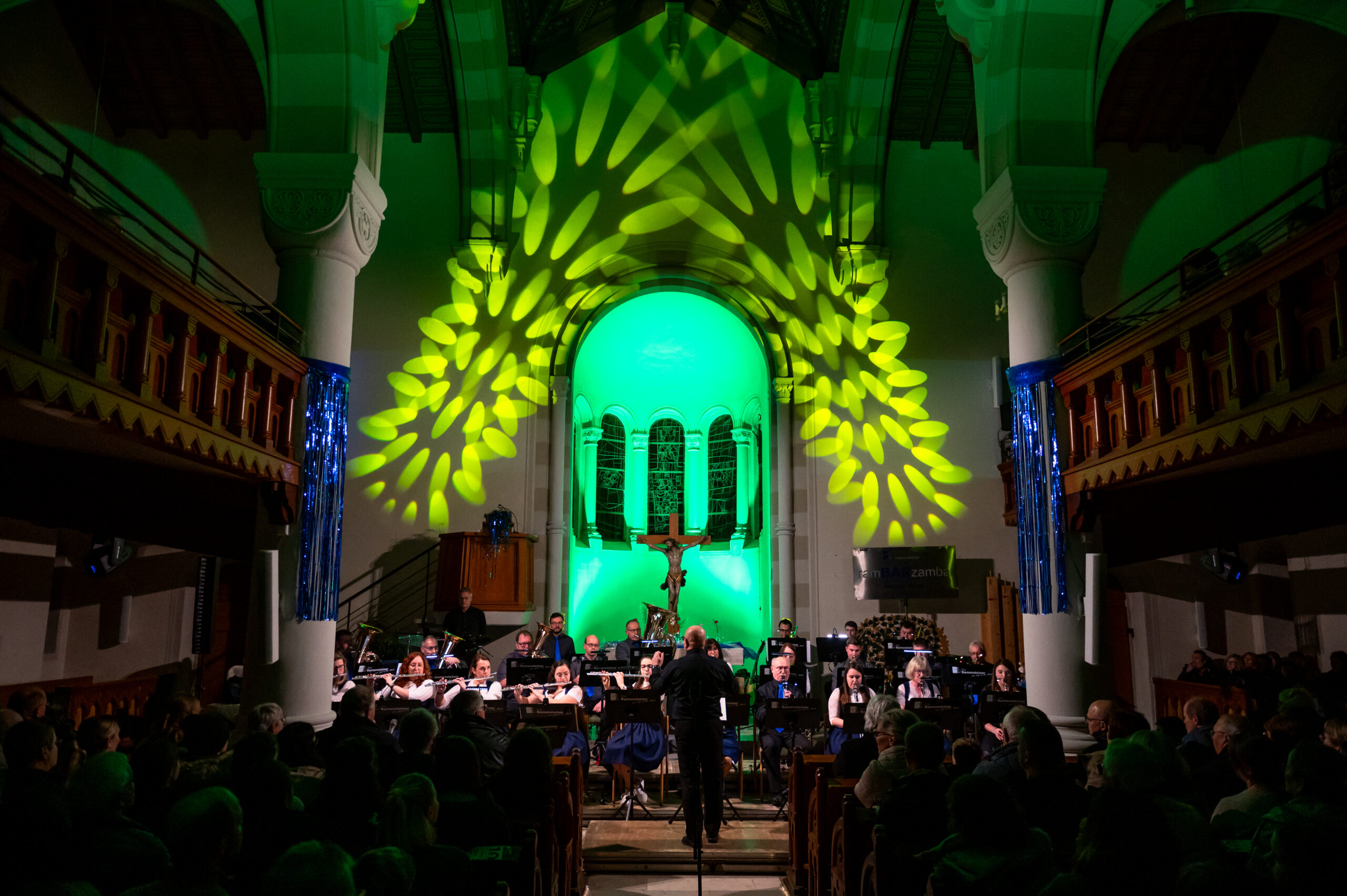 Am 11.01.2026 feierten wir in der vollbesetzten Martinskirche den Auftakt zum 10-jährigen Bestehen der Musikkapelle mit unseren Neujahrskonzert. Aufgrund dessen wollen wir unseren Besuchern etwas Neues bieten. Zusammen mit unserer zahlreichen Jugend, bestehend aus musikalischer Früherziehung, Blockflöten und Jugenkapelle wurde das Konzert durch Christian Prater eröffnet. In diesem Jahr wurden die gespielten Musikstücke an das kleine Theater, gespielt von Christian Prater und Annelie Schön, ausgerichtet. Gestartet hat demnach die Jugend mit dem „McRonalds March“, gefolgt von einer kleinen Theatereinlage von Christian. Thema des Theaterstücks war natürlich das Jubiläumsjahr der Ramensteiner mit einer passenden Party hierzu. Passend hierzu ging es dann durch die aktive Kapelle weiter mit dem klassischen Titel „Rossini“ und den „Movie Blockbustern“. Christian Prater erzählte mit Hilfe von Annelie Schön in Kürze die Geschichte des 10-jährigen Bestehens der Ramensteiner. Das abwechslungsreiche Programm lud dann, unterstrichen durch farbige Lichteffekte und Videos, mit dem „Eighties Flashback“ zum Mittanzen ein. Ulrich Kramer überzeugte das Publikum als Solosänger mit „Auf gute Freunde“ der Böhsen Onkelz. Hier konnten die Zuhörer ein phänomenales Gitarrensolo von Tobias Thumm lauschen. Auch Pfarrerin Hekmat hat sich zu den Ramensteinern und dem Thema Musik einige Gedanken gemacht und diese mit allen geteilt. Um das Theaterstück musikalisch weiterhin zu unterstützen, daa Annelie Schön „am Radio drehte“, wurden Auszüge aus „Schatzi schenk mir ein Foto“ und der „Vogelwiese“ angespielt, was das Publikum zum Mitklatschen animierte. Mit „I want it that way“ und „Shut up and dance with me“ schlossen die Ramensteiner das Konzert im Party-Modus ab und erreichten hier den Höhepunkt.